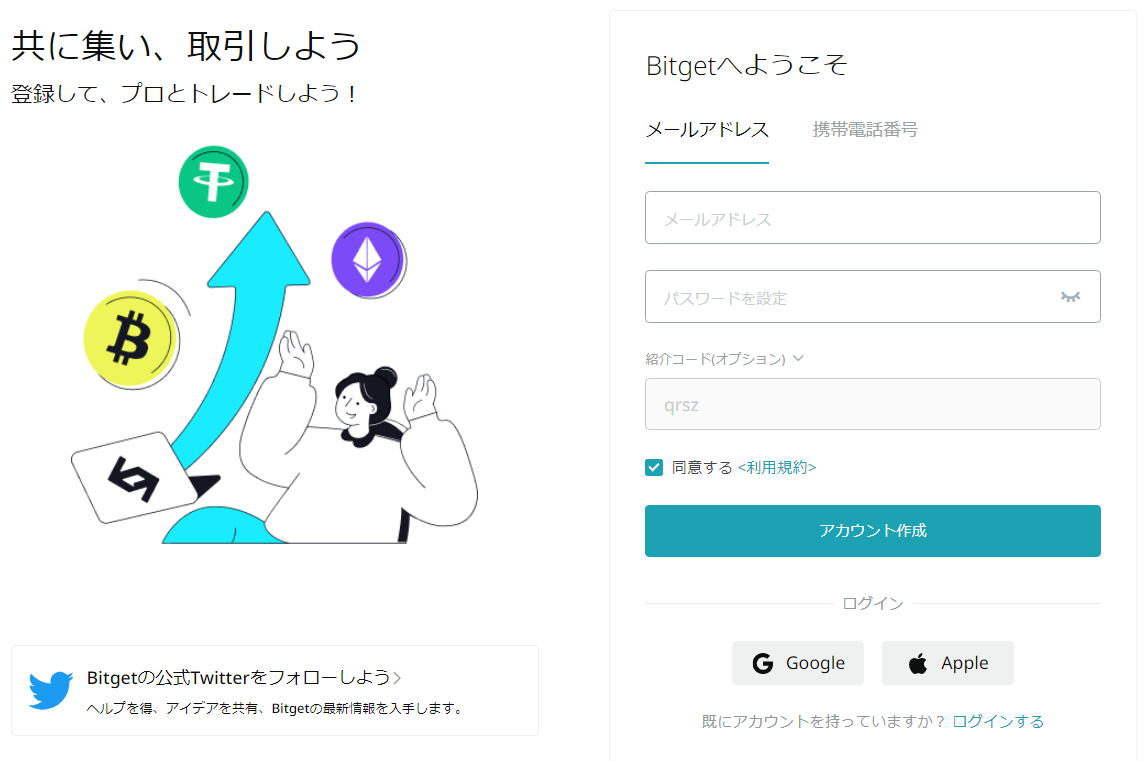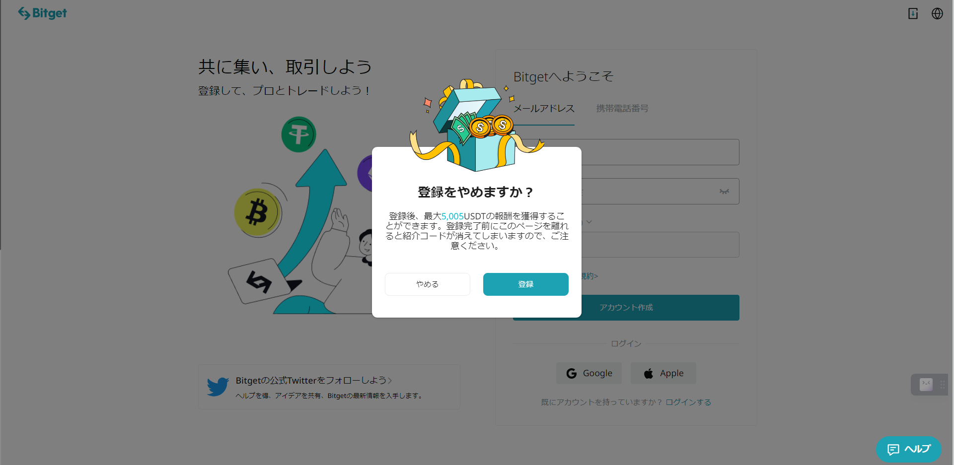 まずは、Bitgetの以下のボタンよりアクセスし、「今すぐ登録」をクリックしましょう。